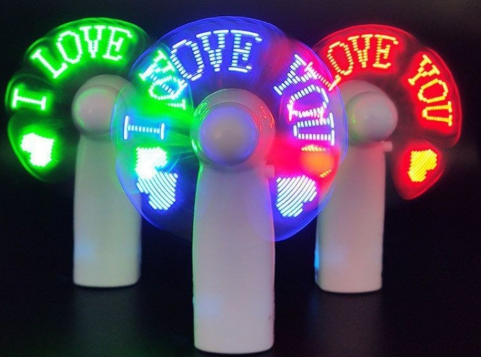 Portable handheld mini USB LED fan with flashing text, customizable logo, and colorful handle options — perfect for gifts, promotions, and advertising.